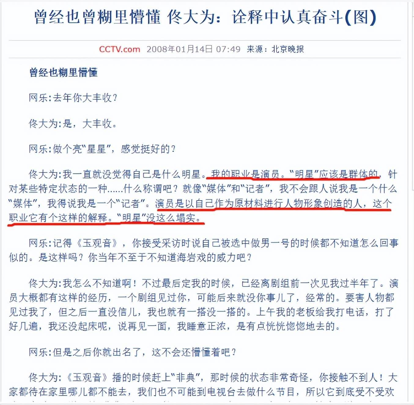 在一则采访中,佟大为“羞于承认”自己是一个明星,认为其只是个演员,明星只是个“群体”名词。